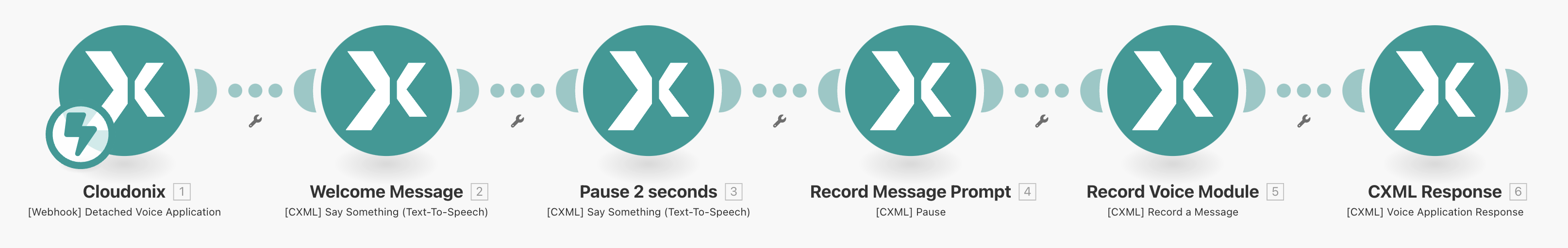 The above CXML document, generated from the scenario, will instruct Cloudonix to start a recording and playback the messages in sequence. If the platform identifies that the remote party started talking, it will stop the playback and wait for the recording to complete.