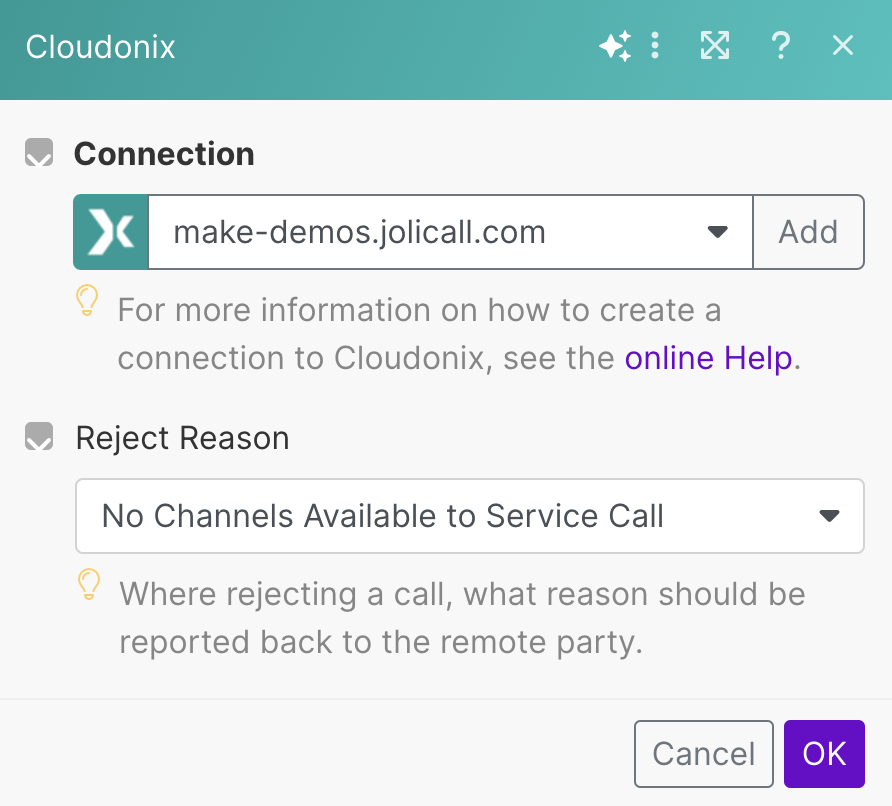 This module provides the developer access to the Cloudonix Reject Verb. Activating this module will instruct your currently running voice application to reject the current active voice call. Rejecting a currently active voice call will result in its disconnection and termination of the currently running voice application.