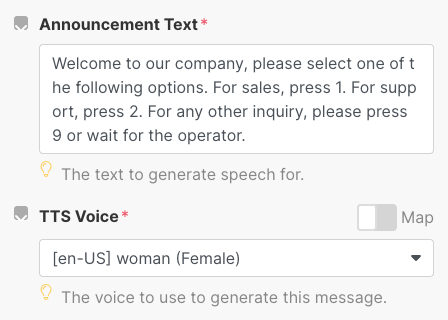 <Say voice="woman">Welcome to our company, please select one of the following options.
