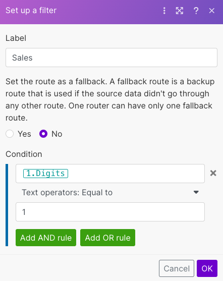 Our Router will examine the inbound request "Digits" values, which will contain the value of the keypress from the caller. The Router branches are filtered as following: