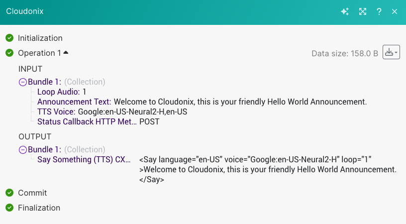 <Say language="en-US" voice="Google:en-US-Neural2-H" loop="1">Welcome to Cloudonix, this is your friendly Hello World Announcement.</Say>