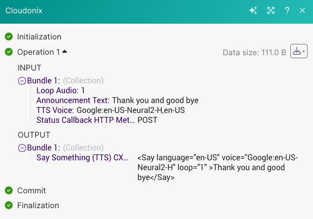 <Say language="en-US" voice="Google:en-US-Neural2-H" loop="1">Thank you and good bye</Say>