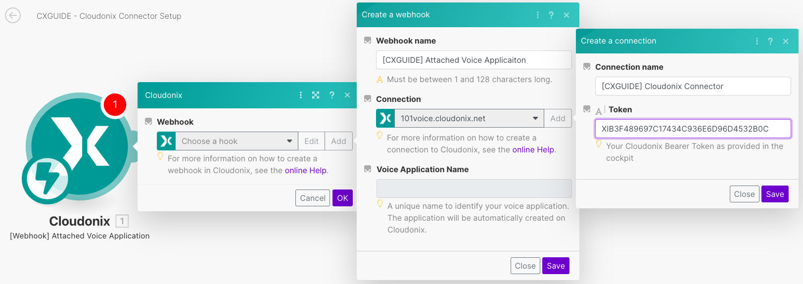 Paste the previously created Voice Application Authorization Key into the proper input box. This will ensure that only requests that include this key will be served by your Make.com scenario. Once completed, the scenario canvas should look like this: