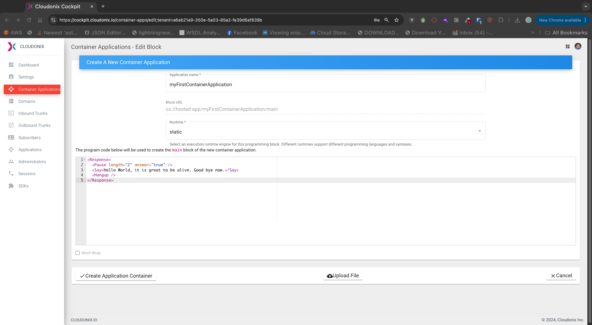 Container applications are based upon pre-defined Blocks, where each block may be implemented a different technology runtime. We recommend that you read more about container applications, in the Cloudonix REST API Data Models section.