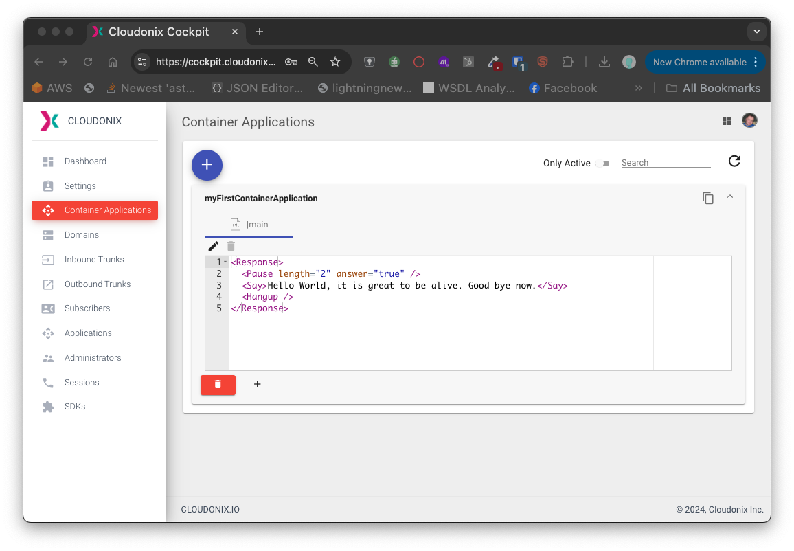 The Container Application model stores an installation of a voice application that is hosted and served directly from Cloudonix servers. The software source code that executes the Cloudonix voice application is stored in Cloudonix servers and is executed on-demand by the Cloudonix APP.core voice application runtime - in a similar way to how "serverless applications" are hosted in Amazon Web Services Lambda or Azure Functions.