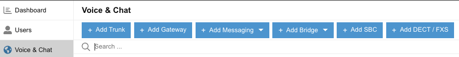 Logon to your 3CX management portal, and click the "Admin" option, the select "Voice & Chat" option from the admin menu. Once the menu appears, click the "+Add Trunk" button to start the setup process:
