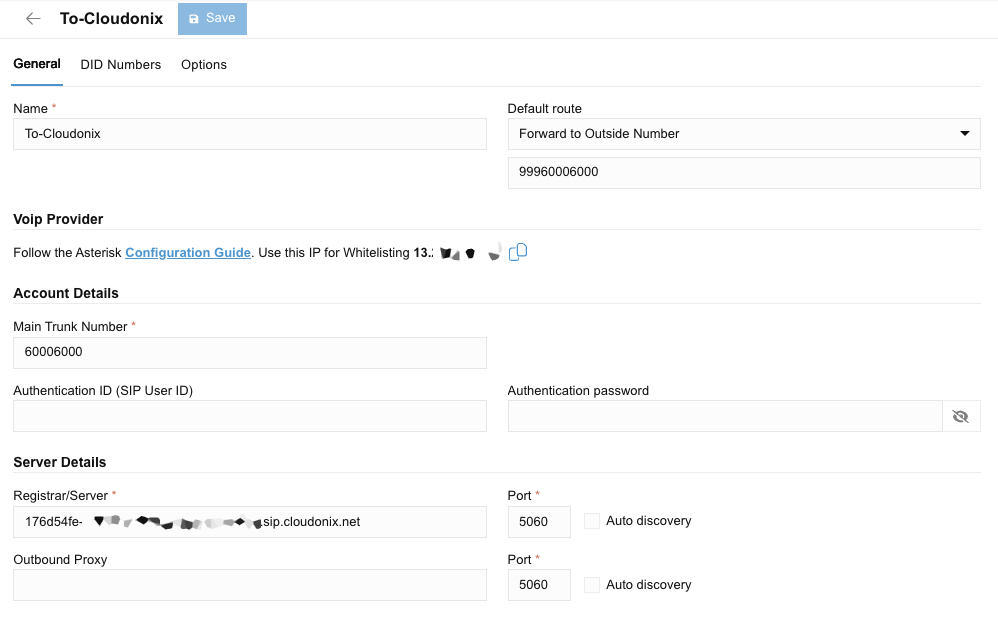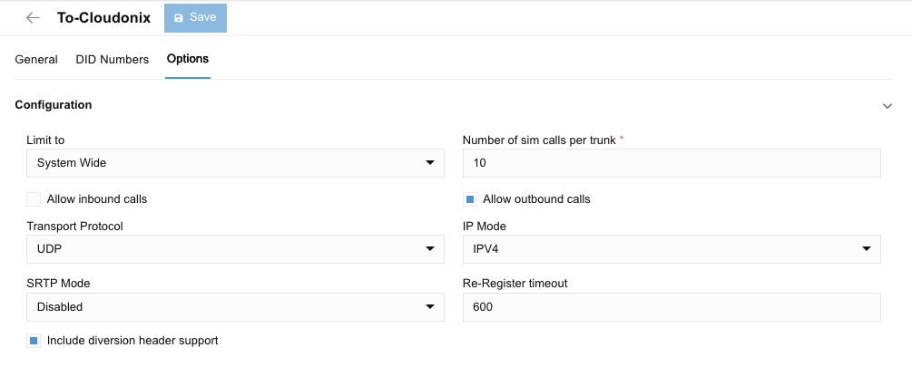 Give your new trunk a meaningful name, like To-Cloudonix, indicating that this trunk will carry calls from 3CX to Cloudonix. Assign a Main Trunk Number to this trunk, which can be an arbitrary number. This number will later on need to be configured in Cloudonix as a voice application DNID (Read more here). In addition, pay attention to enter your SIP trunk host name for inbound calls, which can be found under Inbound Trunks of your Cloudonix domain (Read more here)