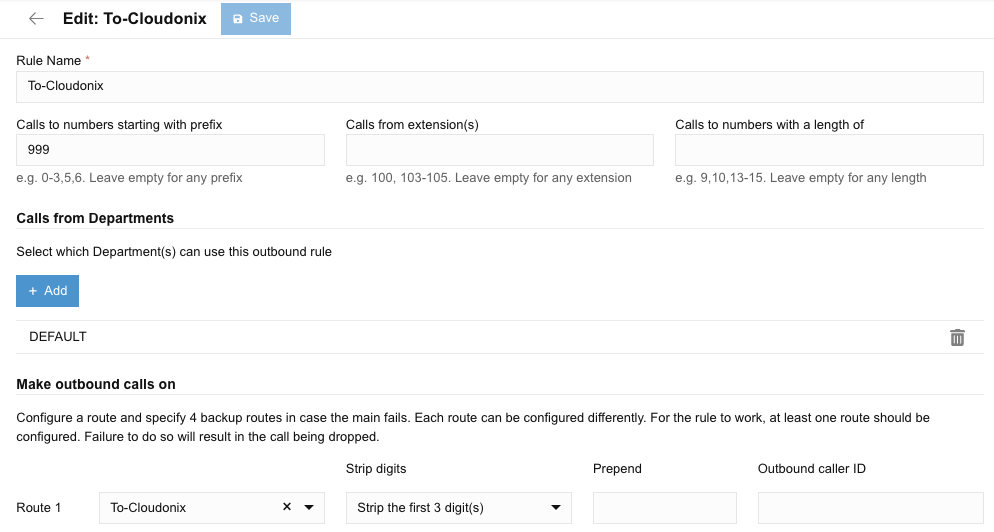 this rule. Then set the Make outbound calls on to route via the previously created To Cloudonix SIP trunk,