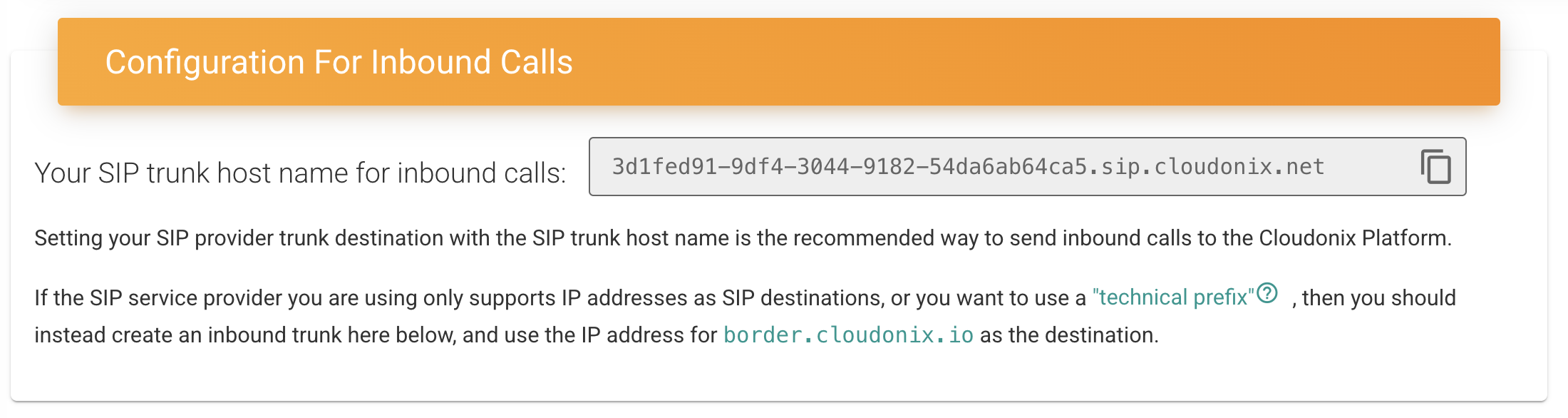 Before we begin, you will need to retrieve your Cloudonix domain inbound calls host name (aka: inbound domain alias). This can be retrieved from your Cloudonix account dashboard, under the Inbound Trunks section.