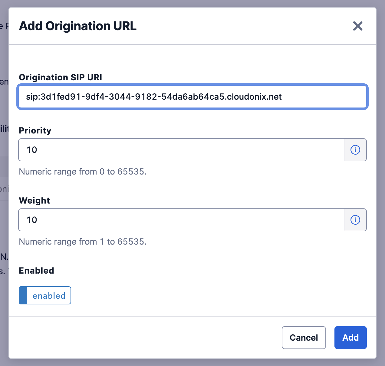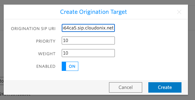 Now, click the blue plus button to add a new SIP origination target URI. The following screen will appear: