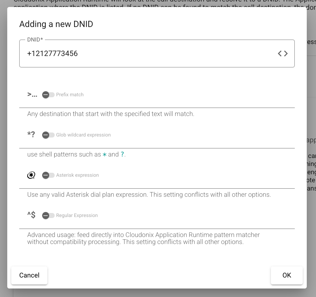 Asterisk Expression | The DNID entered is foramatted as an Asterisk dialplan expression, eg: 1212777XXXX. |